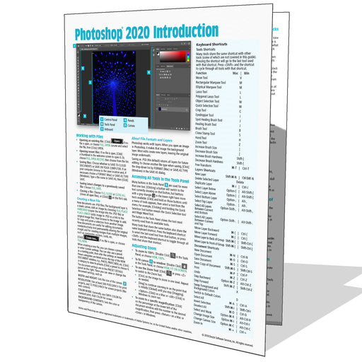 This 4-page laminated guide for Adobe Photoshop CC 2020 shows step-by-step instructions and shortcuts for image enhancement, image manipulation, po...