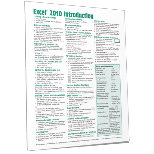Laminated quick reference showing step-by-step instructions and shortcuts for how to use Microsoft Office Excel 2010. See topics below.This guide i...