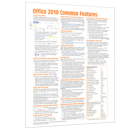Laminated quick reference guide showing step-by-step instructions and shortcuts for how to use features of Microsoft Office 2010 that are common to...