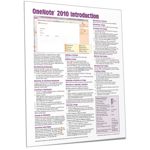 Laminated quick reference showing step-by-step instructions and shortcuts for how to use Microsoft OneNote 2010. The following topics are covered: ...