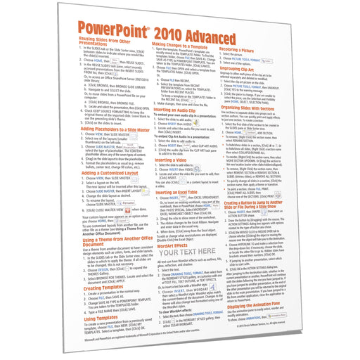 Laminated quick reference guide showing step-by-step instructions and shortcuts for how to use advanced features of Microsoft Office PowerPoint 201...