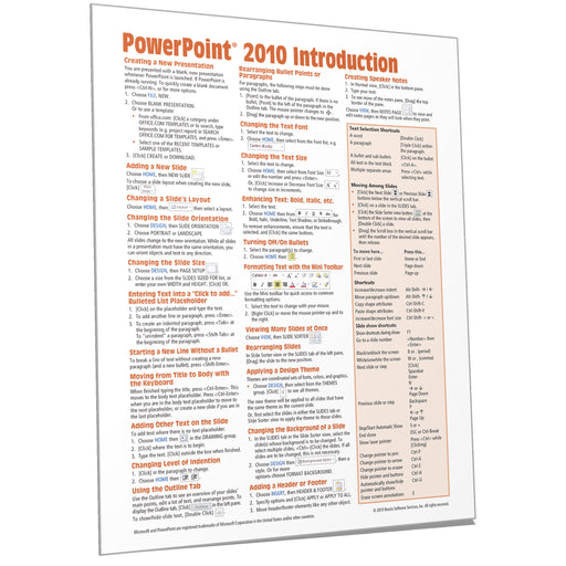 Laminated quick reference card showing step-by-step instructions and shortcuts for how to use Microsoft Office PowerPoint 2010. This guide also ava...