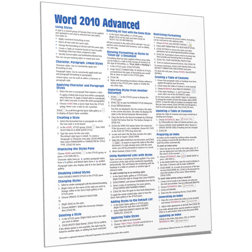 Laminated quick reference card showing step-by-step instructions and shortcuts for how to use advanced features of Microsoft Office Word 2010. The ...