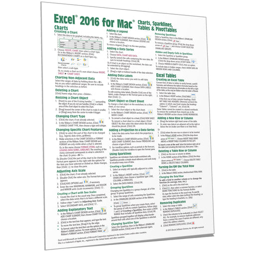 Laminated quick reference card showing step-by-step instructions and shortcuts for Microsoft Excel 2016 for Mac.The following topics are covered: P...