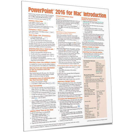 Laminated quick reference card showing step-by-step instructions and shortcuts for how to use Microsoft PowerPoint 2016 for Mac to create impressiv...