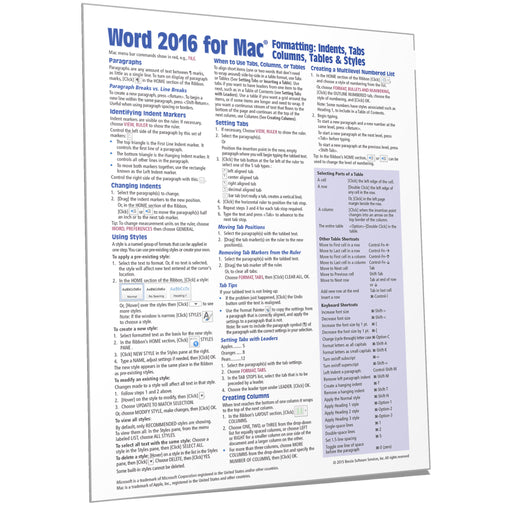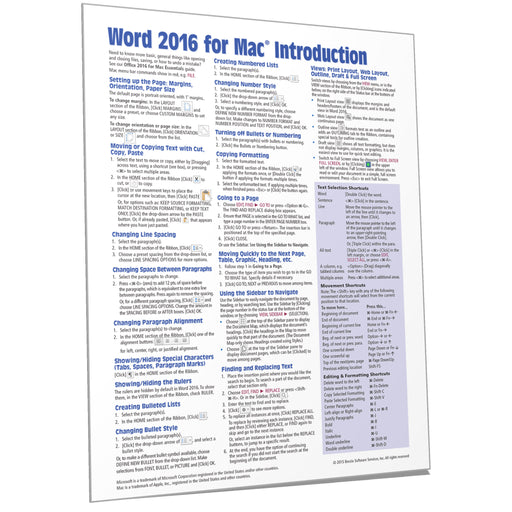 Laminated quick reference card showing step-by-step instructions and shortcuts for how to use Microsoft Word 2016 for Mac. The following topics are...