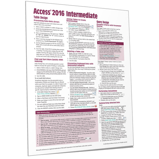 Laminated quick reference guide showing step-by-step instructions and shortcuts for how to use intermediate level features of Microsoft Access 2016...