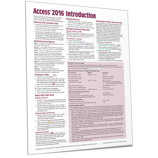 Laminated quick reference guide showing step-by-step instructions and shortcuts for how to use Microsoft Access 2016. See topics below.See also our...
