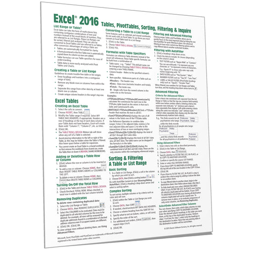Laminated quick reference card on Microsoft Office Excel 2016 for Windows showing step-by-step instructions and shortcuts for how to use tables, Pi...
