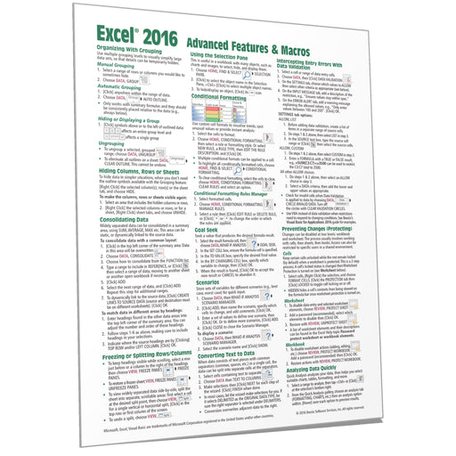 Laminated quick reference guide showing step-by-step instructions and shortcuts for how to use advanced features and macros in Microsoft Excel 2016...