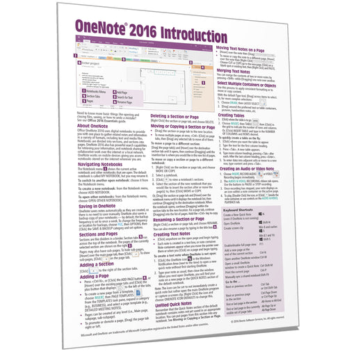 Laminated quick reference showing step-by-step instructions and shortcuts for how to use Microsoft OneNote 2016. Click here for other versions: 201...