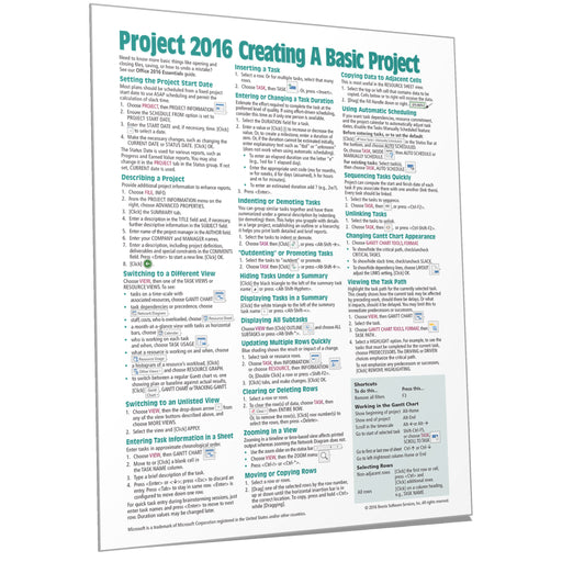 Laminated quick reference guide showing step-by-step instructions and shortcuts for how to use Microsoft Office Project 2016. See also our related ...
